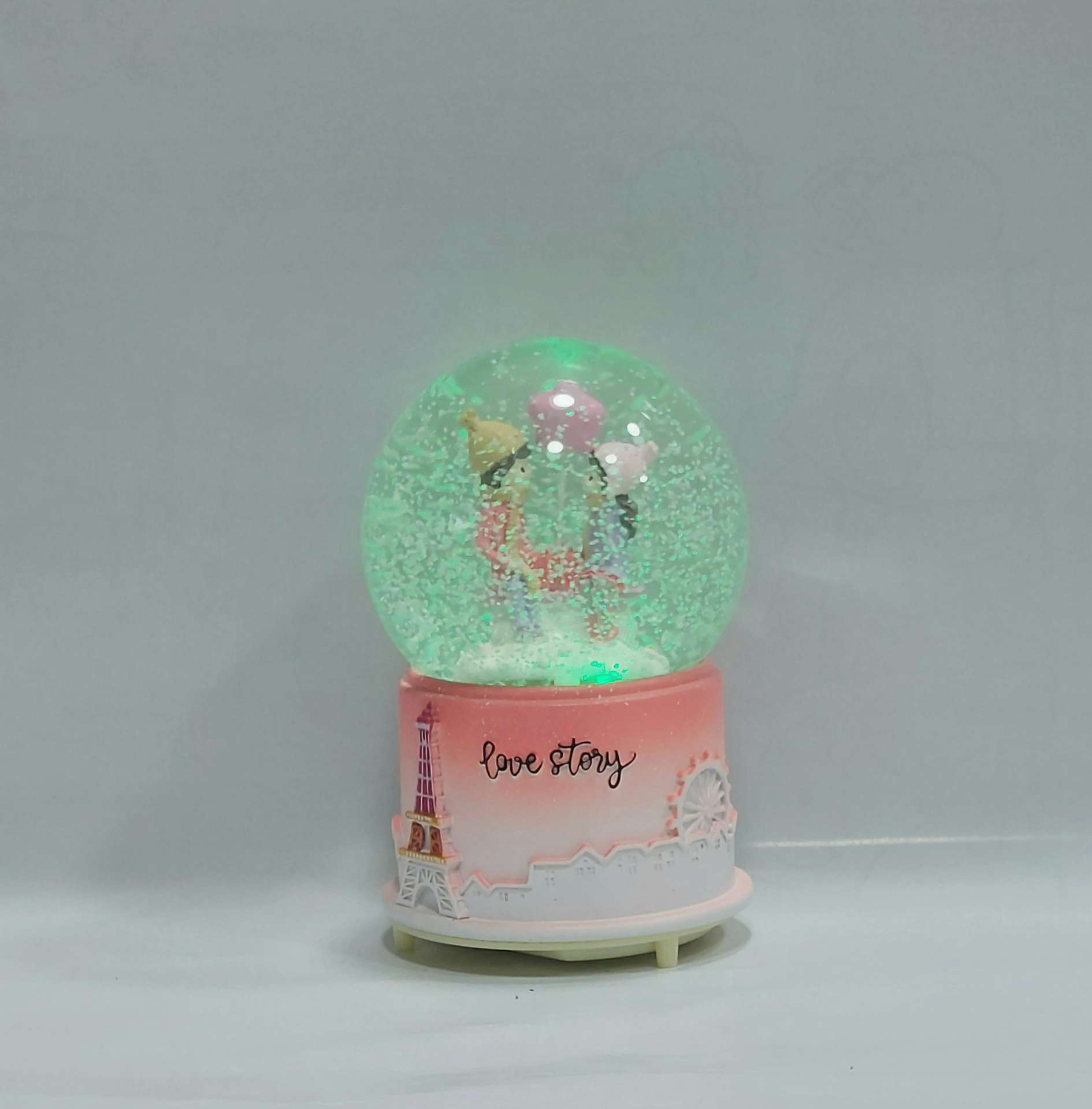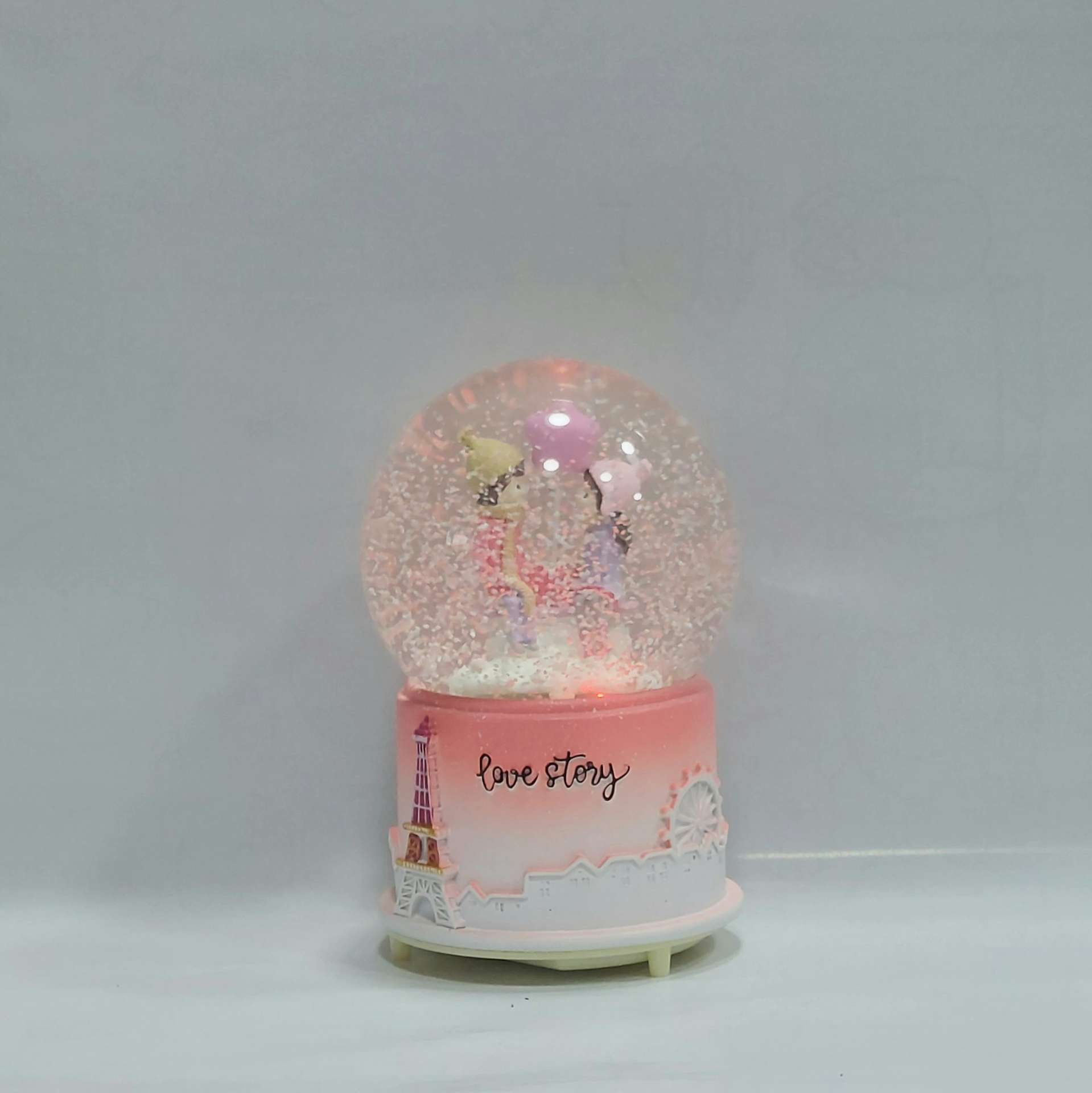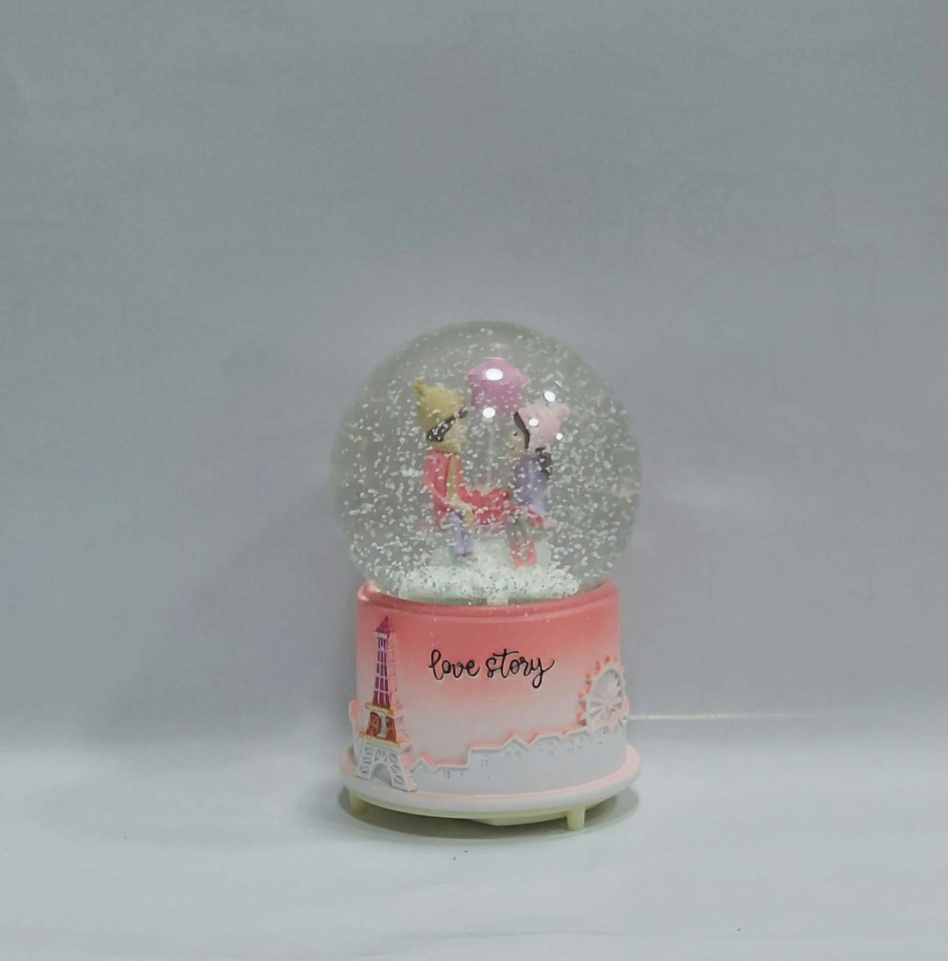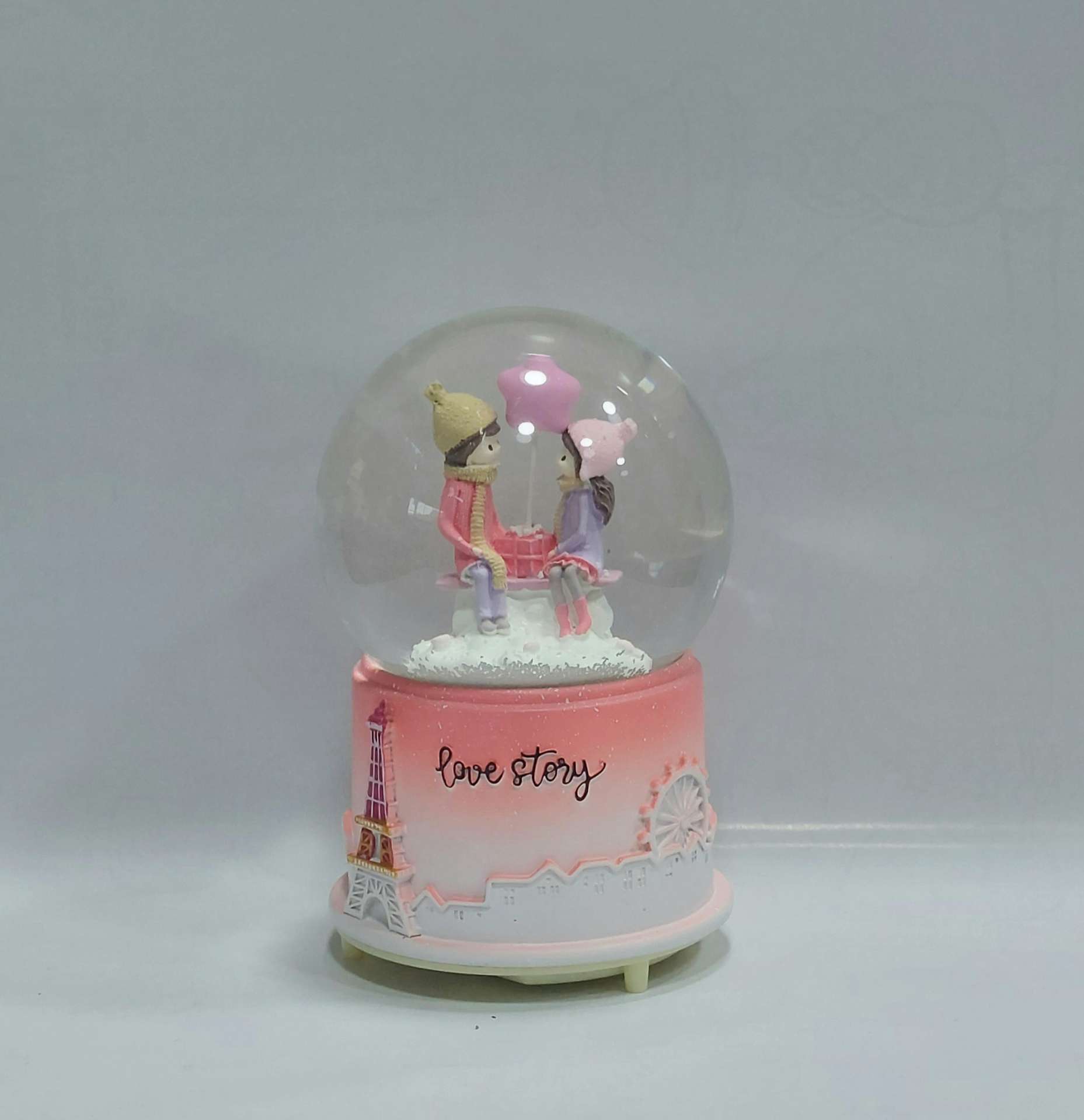 درون این گوی، مجسمه دو عاشق با جزئیات ظریف و رنگآمیزی دقیق دیده میشود که حس عشق، آرامش و لحظهای شاعرانه در پاریس را منتقل میکند.