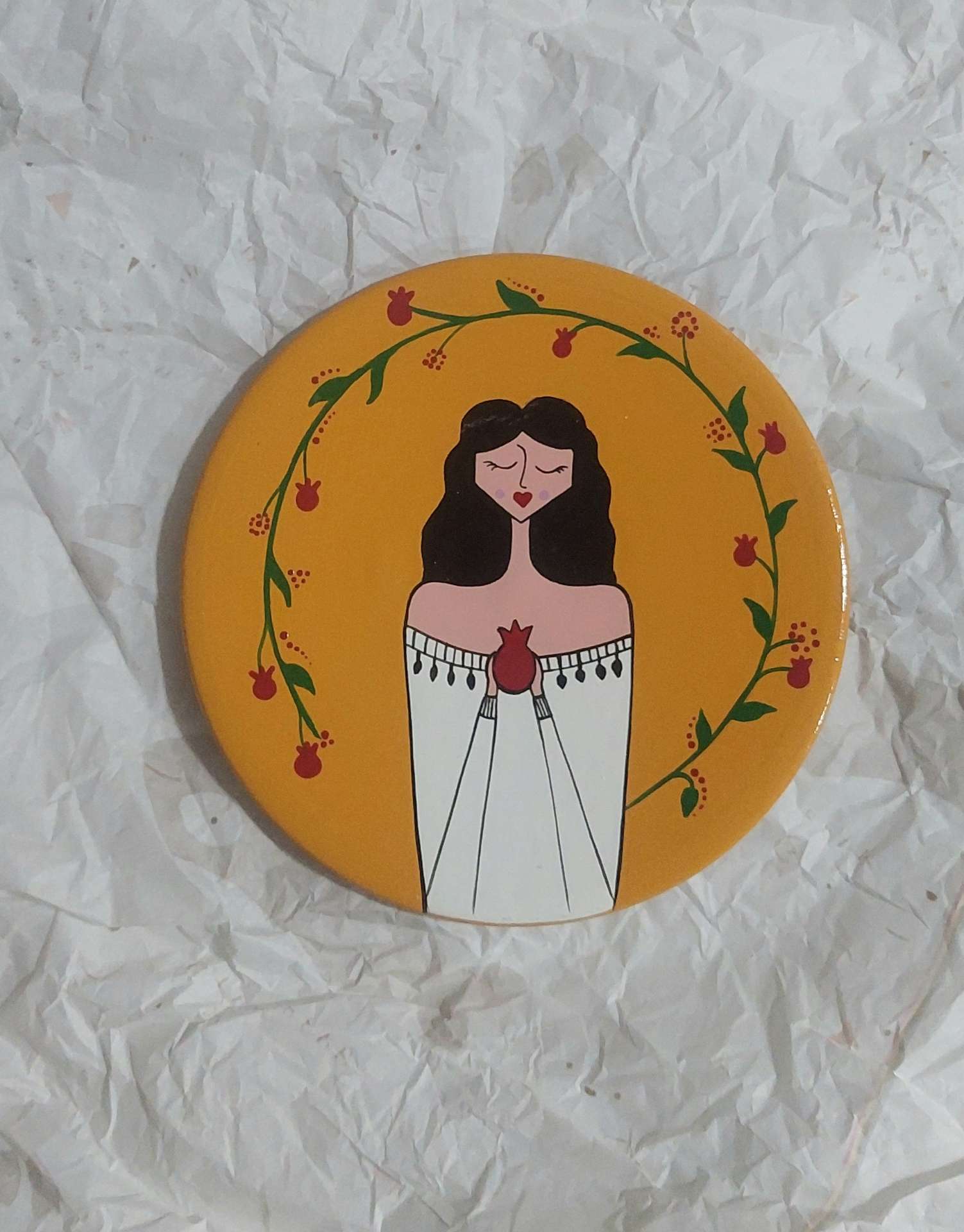 این دیوارکوب سفالی هنرمندانه با قطر ۱۵ سانتیمتر، نمادی از گرمای شب یلدا و زیبایی هنر ایرانی است. طرح ظریف دختر انار بهدست، با لبخندی آرام و رنگهایی زنده، حس شادی و زندگی را به فضای خانه میآورد.