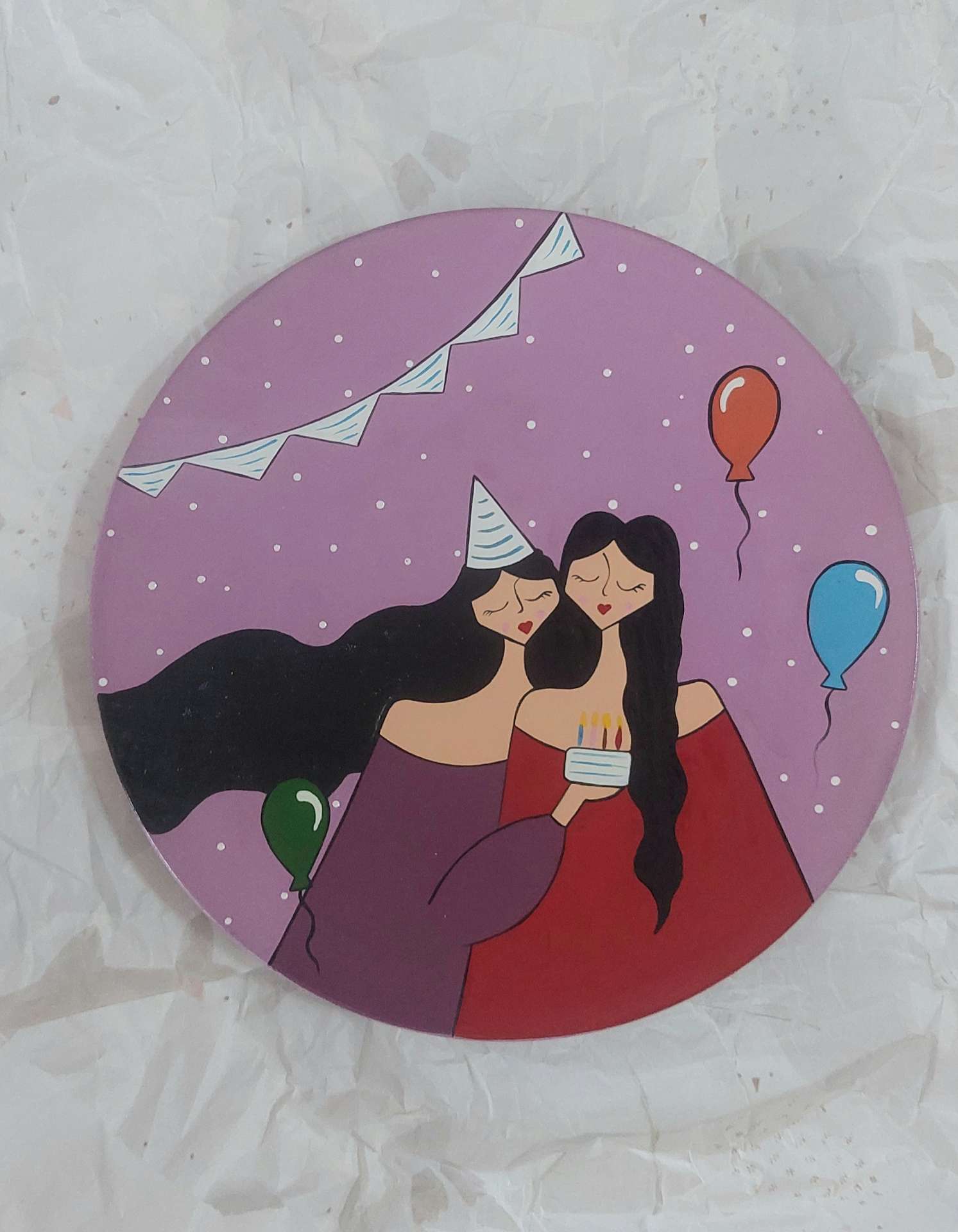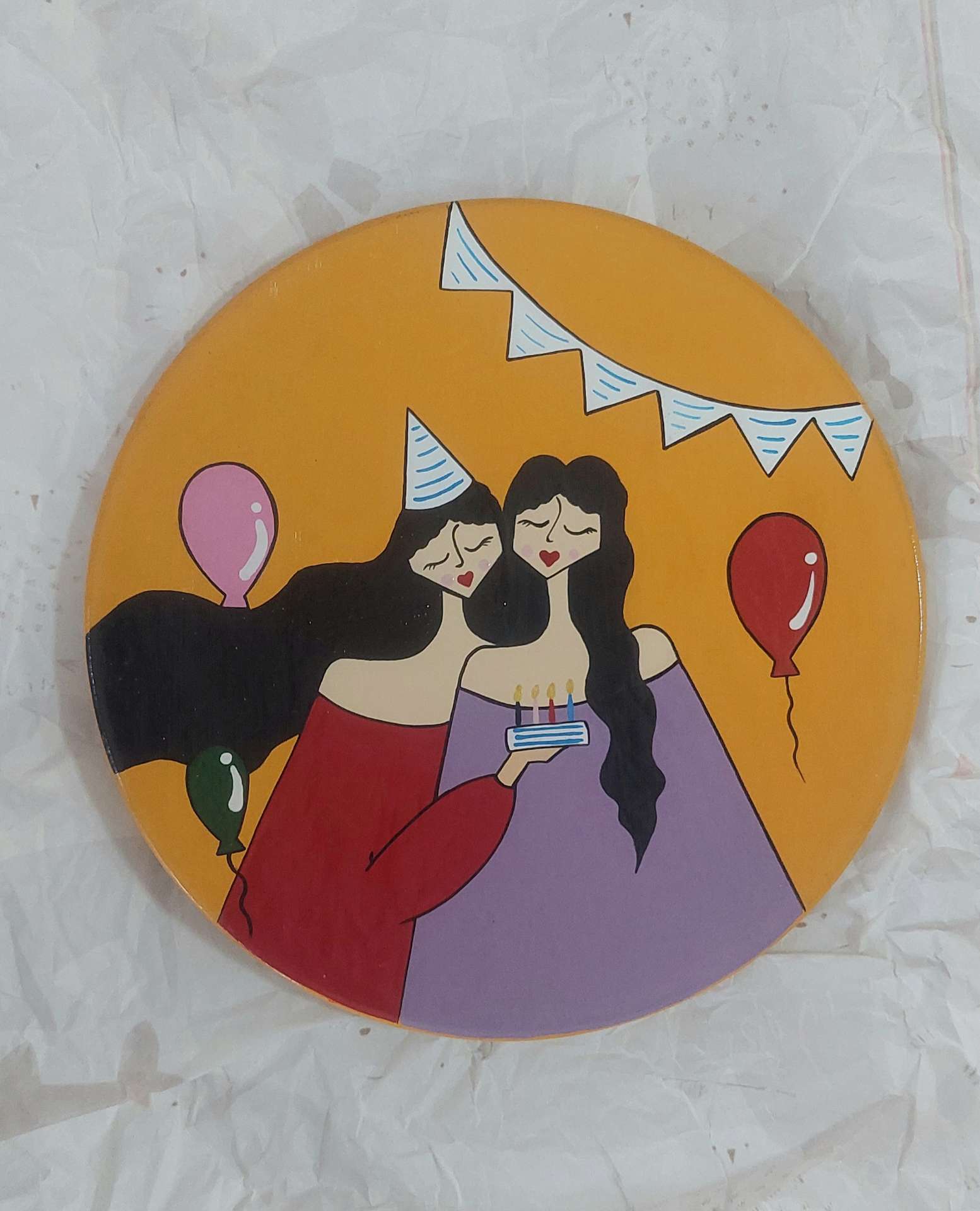 این دیوارکوب سفالی با قطر ۲۰ سانتیمتر، نمایانگر لحظهای شاد و پرانرژی از جشن تولد است—جایی که دو دختر با چهرههایی خندان و پر از هیجان، در دنیایی رنگارنگ غرق در شادیاند.